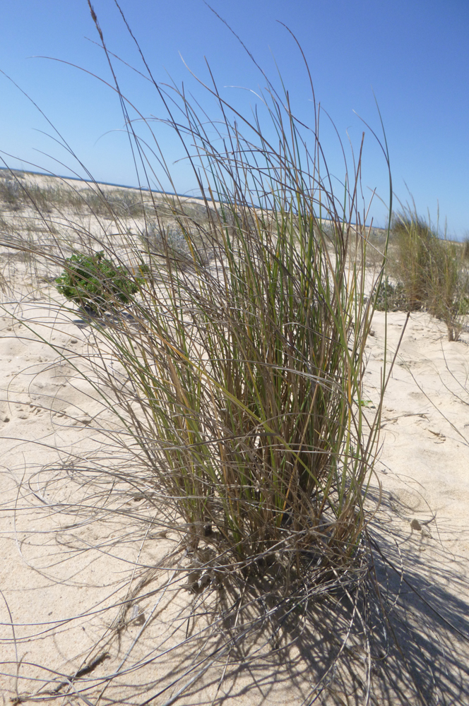 É uma erva perene que forma aglomerados rígidos e resistentes de hastes eretas que podem atingir até 1,2 m de altura. Cresce a partir de uma rede de rizomas espessos que lhe dão uma âncora robusta no substrato de areia e permitem que cresça em altura à medida que a areia se acumula. As folhas são pontiagudas e podem atingir 1 m de comprimento.